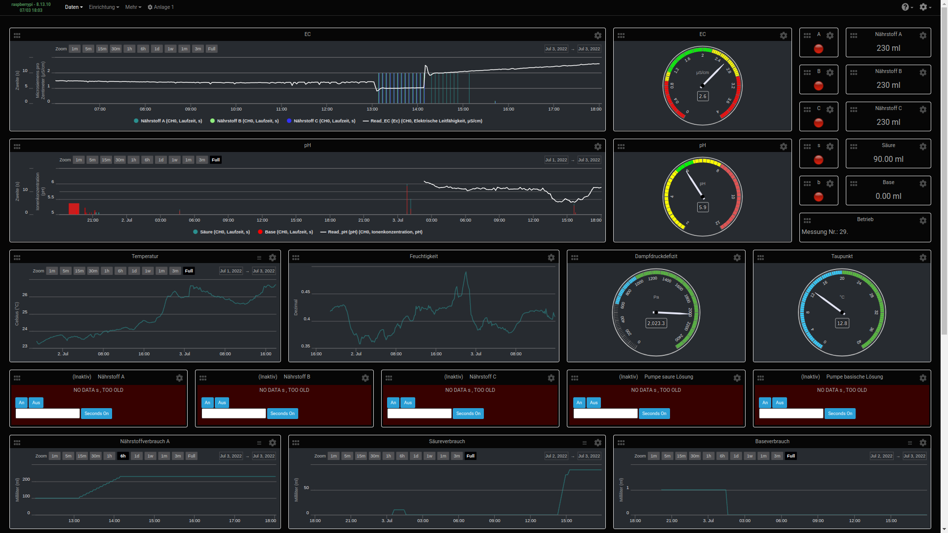 Dies ist ein Screenshoot der Steuerzentrale einer Anlage Typ 2. Sie zeigt die aktuelle Situation zum Nährstoffverbrauch, dem EC-Wert der Nährlösung, dem pH-Wert und die Temperatur der Nährlösung und den Verbrauch an allen Nährstoffen. Auch angezeigt wird der Verbrauch von Säure und Base um den pH-Wert des Nährstoffs im korrekten Bereich zu halten. Alle Grenz- und Bereichswerte können individuell eingestellt werden. Ebenso können alle Nährstoffzugaben ebenso wie Säure und Base von Hand in Echtzeit an diesem Bildschirm gesteuert werden.
