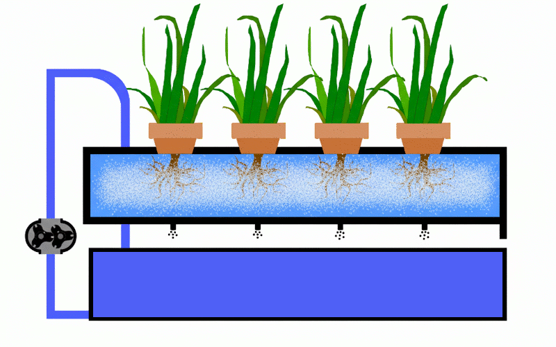 Bei der Tröpfchenbewässerung (Drip System) wDrip Systemird über eine Tropfleitung die Nährstofflösung auf das Substrat um die Pflanzen getropft. Die Nährstofflösung fließt an den Wurzeln vorbei und versorgt diese direkt. Die überschüssige Flüssigkeit fließt ab und liefert dabei Sauerstoff in den Wurzelbereich.