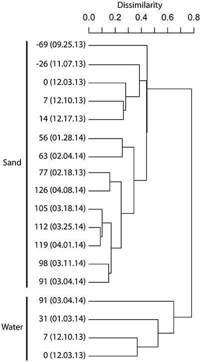 ABBILDUNG 2. DENDROGRAMM, DAS DIE ZUSAMMENSETZUNGSBEZIEHUNGEN DER BAKTERIENGEMEINSCHAFT ZWISCHEN BIOFILTERSAND- UND BIOFILTERWASSERPROBEN VERANSCHAULICHT . Ein Complete-Linkage-Dendogramm wird anhand von Bray-Curtis-Stichproben-Unähnlichkeitsbeziehungen dargestellt, die auf Knotenverteilungen der minimalen Entropiezerlegung zwischen Stichproben basieren (V6-Datensatz). Die Blätter des Dendrogramms sind mit der Tageszählung beschriftet, wobei 0 den Beginn eines Fischaufzuchtzyklus darstellt. Negative Zahlen sind Tage vor einem neuen Aufzuchtzyklus. Auf die Tageszählung folgt das Datum der Probenahme (MM.TT.JJ). Siehe Tabelle S1 für Beispielmetadaten. |