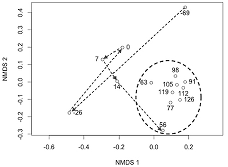 ABBILDUNG 3. NICHTMETRISCHES MULTIDIMENSIONALES SKALIERUNGSDIAGRAMM DER UNÄHNLICHKEIT DER ZUSAMMENSETZUNG DER BRAY-CURTIS-BAKTERIENGEMEINSCHAFT ZWISCHEN DEN STICHPROBENZEITPUNKTEN . nMDS Stress = 0,07 und Dimensionen (k) = 2. Pfeile zeigen den Verlauf der Probe durch die Zeit vom Ende eines Aufzuchtzyklus (Tagnummer –69 und –26) zu einem Zeitraum ohne Fische (0) und in die nachfolgende Aufzucht Zyklus (7–126). Der Kreis zeigt Proben, die genommen wurden, nachdem die Fische auf eine Größe angewachsen waren, bei der Futterart und -menge stabilisiert waren (3 mm pelletiertes Futter und 3–7 kg Futter pro Tag). |