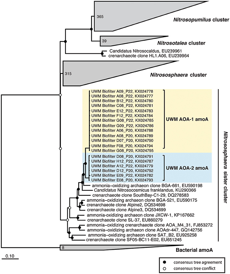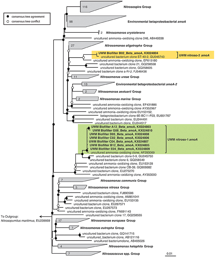 ABBILDUNG 6. KONSENSBAUM DER AMMONIAK-OXIDIERENDEN BAKTERIEN . Ein phylogenetischer Konsensbaum wurde aus phylogenetischen Rekonstruktionen mit maximaler Wahrscheinlichkeit und Bayes'scher Inferenz generiert. Die Unterstützung von Konsensbäumen wird durch farbige Kreise an Baumknoten angezeigt. Eingeklappte Knoten und zugewiesene Namen basieren auf Abell et al. (2012) . Auf Klon- und taxonomische Namen folgen NCBI-Zugangsnummern. Die Klade, die den Nitrosomonas-amoA- Genotyp enthält, UWM - Nitroso - 1 -amoA ist grün hervorgehoben, und UWM - Nitroso -2-amoA ist gelb hervorgehoben. |