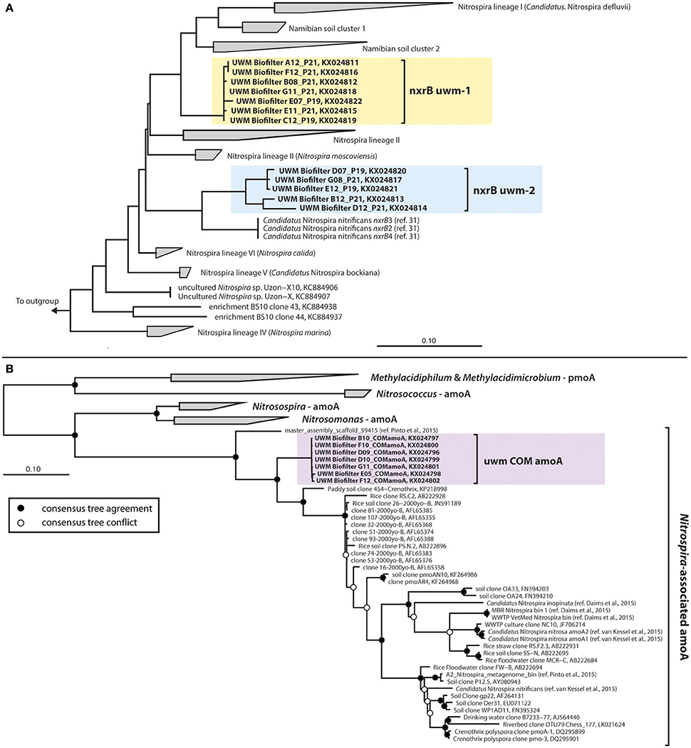ABBILDUNG 7. KONSENS-STAMMBÄUME FÜR NITROSPIRA - ÄHNLICHE (A) nxrB- und (B) amoA- Gene. Für die nxrB-Phylogenie wurde der Konsensbaum von Pester et al. (2014) ist illustriert. Die UWM-Biofilter- und Candidatus Nitrospira nitrificans-Sequenzen wurden dieser phylogenetischen Rekonstruktion mit dem Quick-Add-Parsimony-Tool des ARB-Pakets ( Ludwig et al., 2004 ) hinzugefügt, um die Baumtopologie nicht zu verändern. Für die amoAPhylogenie wurde ein phylogenetischer Konsensbaum aus phylogenetischen Rekonstruktionen mit maximaler Wahrscheinlichkeit und Bayes'scher Inferenz generiert. Die Unterstützung von Konsensbäumen wird durch farbige Kreise an Baumknoten angezeigt. Den Klonnamen folgen NCBI-Zugangsnummern oder ein Manuskriptzitat. In beiden Bäumen sind in dieser Studie generierte Sequenzen mit farbigen Kästchen hervorgehoben. |