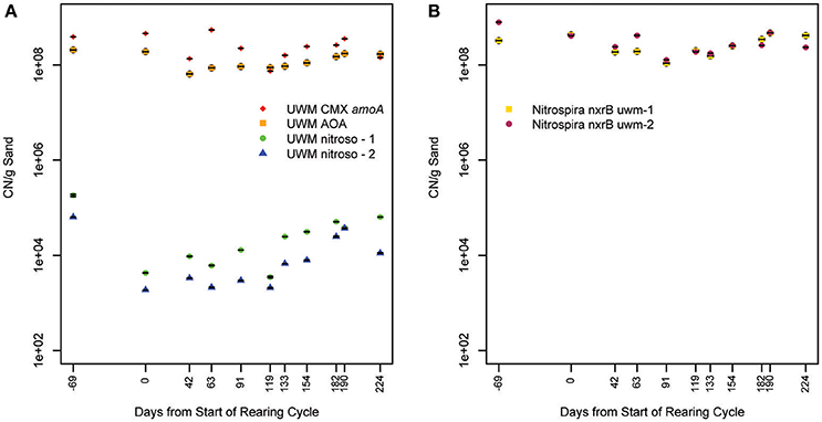ABBILDUNG 8. KONZENTRATION DES NITRIFIKATIONSMARKERGENS ÜBER DIE ZEIT . Diagramm (A) veranschaulicht die amoA - Kopienzahl (CN) pro Gramm Biofiltersand und Diagramm (B) nxrB CN pro Gramm Biofiltersand für alle identifizierten Genotypen. Die Standardabweichung der dreifachen qPCR-Reaktionen ist für jede Probe angegeben. Die x-Achse gibt die Zeit an, wobei der Zeitpunkt 0 den Beginn eines Fischaufzuchtzyklus darstellt. Proben, die im vorherigen Aufzuchtzyklus gesammelt wurden, sind mit negativen Werten gekennzeichnet. Siehe Tabelle S1 für Beispielmetadaten. |