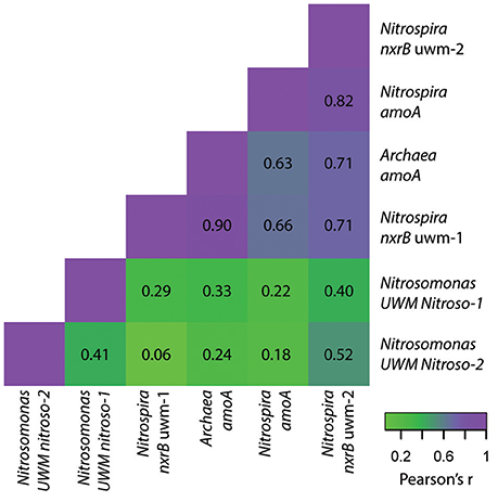 ABBILDUNG 9. HEATMAP DER HÄUFIGKEITSMUSTERKORRELATIONEN FÜR NITRIFIKANTEN-GENOTYPEN . Pearson-Korrelationskoeffizientenwerte (r) sind aufgelistet und gemäß der Stärke der Häufigkeitskorrelation zwischen Markergenen für jeden Genotyp gefärbt. Violette Farben zeigen stärkere Korrelationen und grüne Farben zeigen schwächere Korrelationen an. |