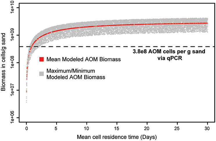 ABBILDUNG 10. MODELLAUSGABE DER AMMONIAK-OXIDATIONSMITTEL-ZELLKONZENTRATION ALS FUNKTION DER MITTLEREN ZELLVERWEILZEIT (MCRT) DES BIOFILTERS . Die rote Linie zeigt Schätzungen der Ammoniak-Oxidationsmittel-Zellhäufigkeit aus der mittleren Änderung der Ammoniakkonzentration über die Filtermatrix als Funktion der mittleren Zellverweilzeit. Der schattierte graue Bereich stellt den Bereich der Zellhäufigkeitsschätzungen aus den minimal und maximal beobachteten Ammoniakentfernungsraten dar. Die horizontale gestrichelte Linie zeigt die qPCR-geschätzte Gesamt-Ammoniak-Oxidationsmittel-Häufigkeit (Ammoniak-oxidierende Archaea + Ammoniak-oxidierende Bakterien + Comammox Nitrospira ) im System an. |