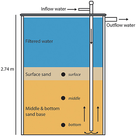 Alle Proben wurden vom RAS-Biofilter (UWM-Biofilter) der Great Lakes Aquaculture Facility der University of Wisconsin-Milwaukee gesammelt. Von der Basis aus gemessen ist der Biofilter ~2,74 m hoch und hat einen Durchmesser von ~1,83 m. Der Wasserspiegel innerhalb des Biofilters beträgt ~2,64 m von der Basis, wobei sich die fluidisierte Sandfiltermatrix bis zu einer Höhe von ~1,73 m von der Basis erstreckt. Der Biofilter ist mit Wedron 510-Quarzsand gefüllt, der durch die Verwendung von 19 Plan-40-PVC-Sonden mit jeweils einem Durchmesser von 3,175 cm auf ~200 % Ausgangssandvolumen fluidisiert wird. Die Sonden erhalten Zufluss aus dem Klärbecken für festen Abfall, der durch die Filtermatrix aufsteigt. Proben für diese Studie wurden in drei Tiefen innerhalb des Wirbelsand-Biofilters entnommen, definiert als Oberfläche (~1,32–1,42 m von der Biofilterbasis), Mitte (~0,81–0,91 m von der Biofilterbasis) und Unterseite (~0,15–0,30 m, aus Biofilterbasis). Abbildungen des UWM-Biofilters und der Probenstellen sind in Abbildung dargestellt1 . Die maximale Durchflussrate des Biofilterzuflusses beträgt 757 l pro Minute, was eine hydraulische Verweilzeit von ~9,52 min ergibt. Typische Systemwasserqualitätsparameter sind wie folgt (Mittelwert ± Standardabweichung): pH 7,01 ± 0,09, Oxidations-Reduktions-Potential 540 ± 50 (mV), Wassertemperatur 21,7 ± 0,9 (°C) und gelöster Sauerstoff (DO) des Biofilterabflusses 8,20 ± 0,18 mg/l. Der Biofilter ist für den maximalen Betrieb bei 10 kg Futter pro Tag ausgelegt, was auf der vorhergesagten Ammoniakproduktion durch den Fischproteinabbau bei dieser Fütterungsrate basiert ( Timmons und Ebeling, 2013 ).