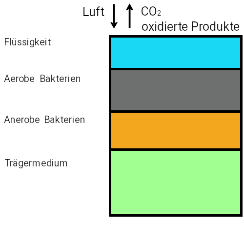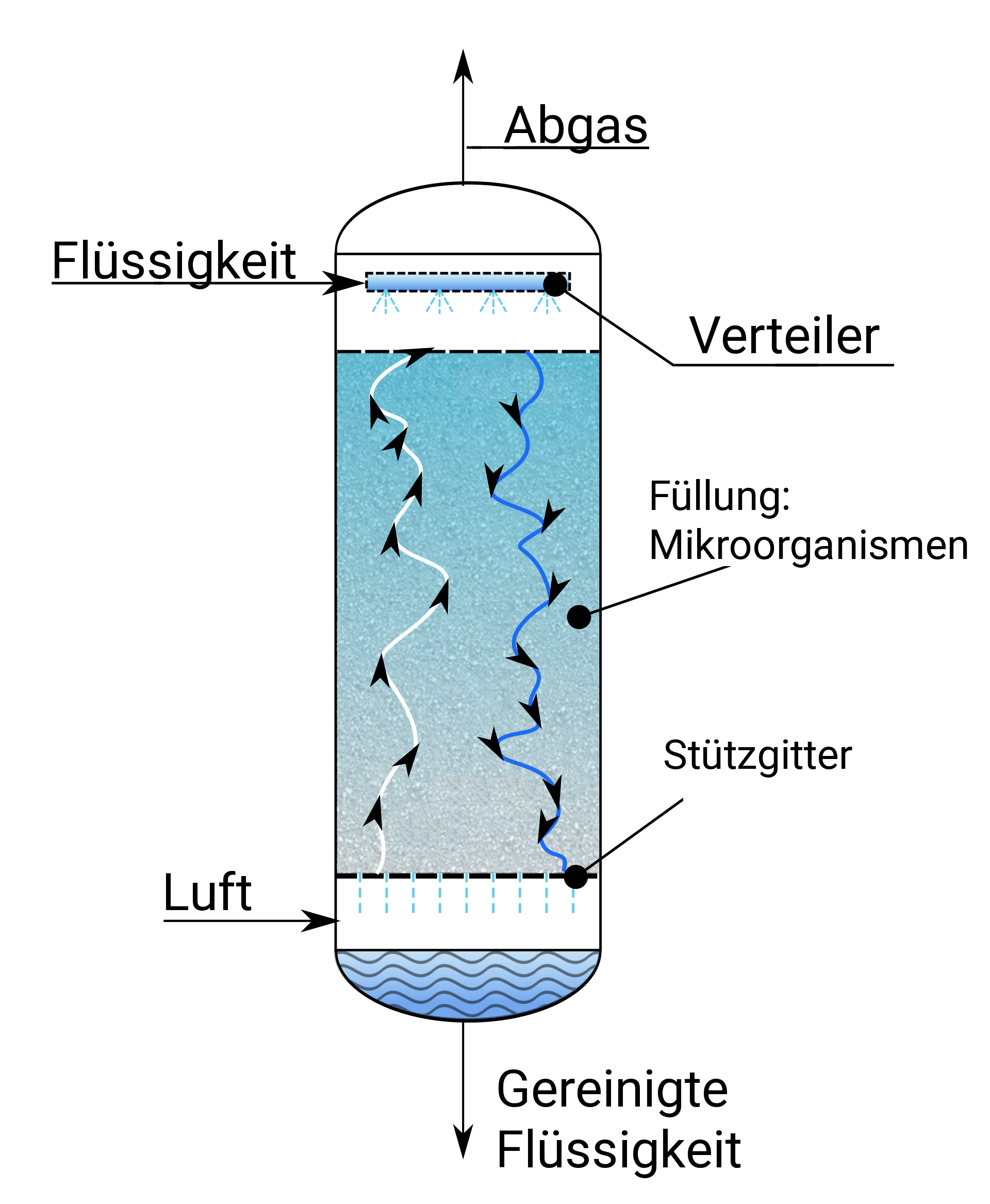 Es handelt sich hierbei nicht um einen Filter im eigentlichen Sinne, da der Hauptzweck die Abscheidung von gasförmigen bzw. gelösten Substanzen und nicht von festen Partikeln ist. Im Gegensatz zum Biorieselbettreaktor einerseits, bei dem sich auf Einbauten im Reaktor ein sogenannter biologischer Rasen bildet, der kontinuierlich gespült wird, und dem Biowäscher anderseits, bei dem die Mikroorganismen überwiegend in einer Waschflüssigkeit suspendiert sind, sind die Mikroorganismen beim Biofilter auf einer Matrix, die teilweise für die Nährstoffversorgung sorgt, fixiert.