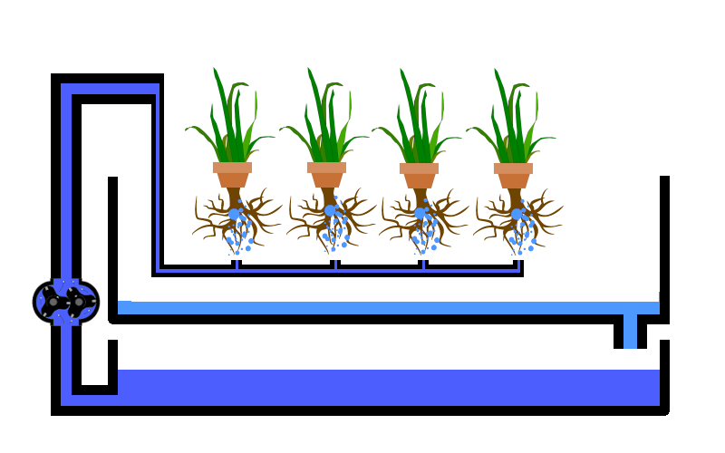 Bei der Tröpfchenbewässerung (Drip System) wDrip Systemird über eine Tropfleitung die Nährstofflösung auf das Substrat um die Pflanzen getropft. Die Nährstofflösung fließt an den Wurzeln vorbei und versorgt diese direkt. Die überschüssige Flüssigkeit fließt ab und liefert dabei Sauerstoff in den Wurzelbereich.