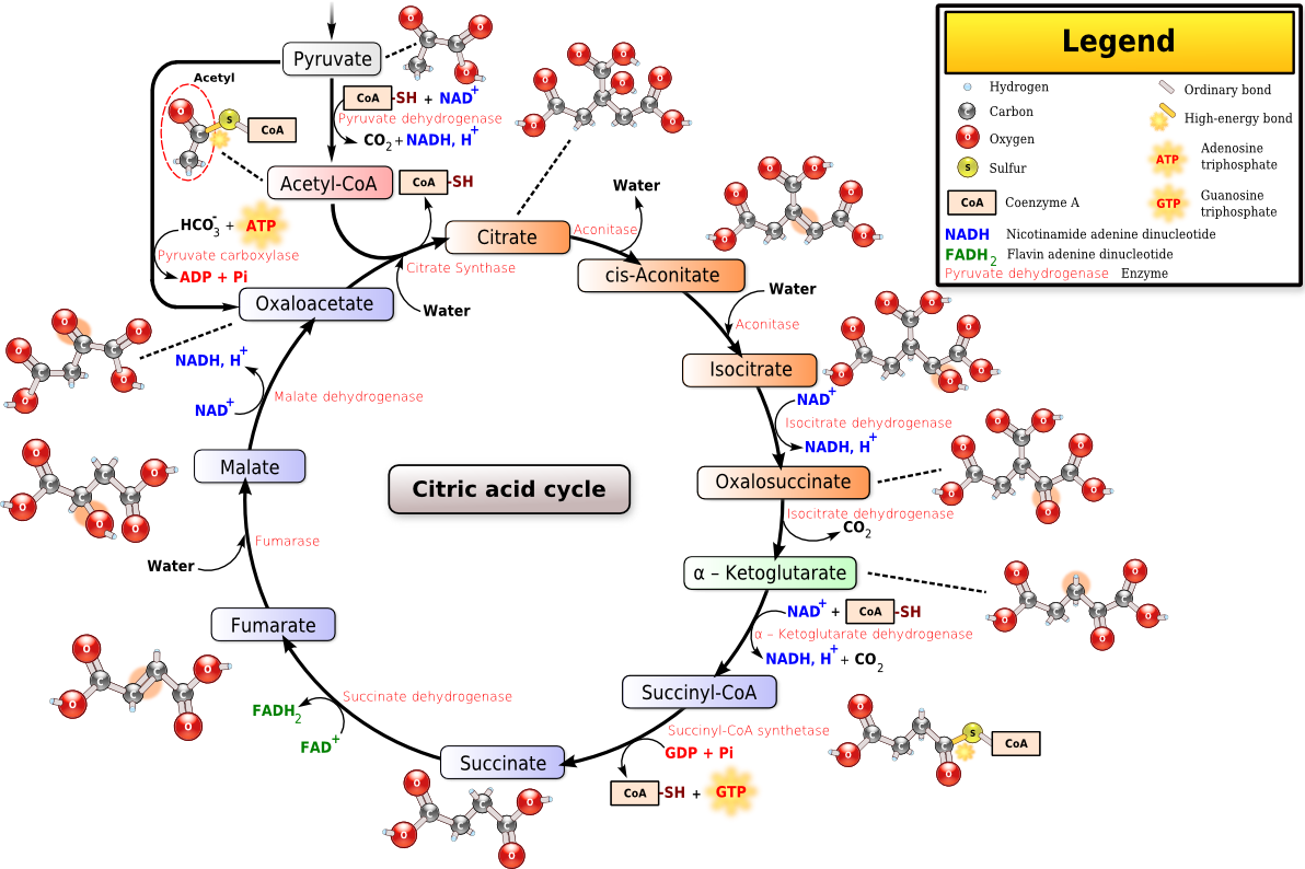 Der nächste Schritt ist eine Vorstellung davon zu bekommen welche Elemente, und daraus ableitend welche Verbindungen, sich im Endprodukt befinden. Eine solche Analyse (die Pflanze kommt in einen Mixer und wird je nach gesuchten Verbindungen mit zusätzlichen Chemikalien versetzt), hat leider den Hacken, das sie nicht wirklich alles verrät was uns interessiert. Das liegt daran, dass sich die chemischen Verbindungen selten in der Form in der Pflanze wiederfinden lassen, in der sie ursprünglich zugesetzt wurden. Hier kommt die Biologie ins Spiel. Als Beispiel sei hier nur der Zitronensäurezyklus erwähnt, den wir Ihnen nicht vorenthalten wollen. Er veranschaulicht die Komplexität des Stoffwechsels.