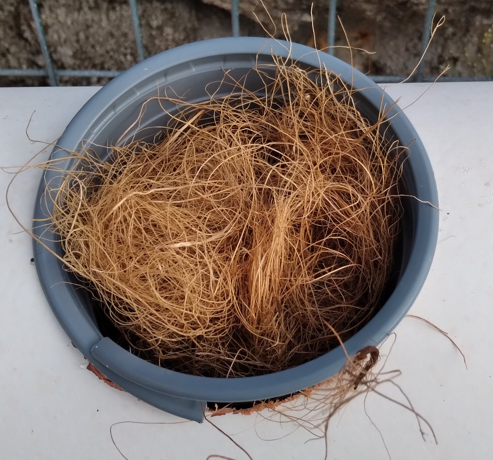 Als "Topf" eignen sich die handelsüblichen Blumentöpfe sehr gut, da sie nicht so schnell an der Sonne zerfallen und günstig zu haben sind. Wir empfehlen etwas größere Töpfe für das einpflanzen. Sie sollten etwas größer sein als die Bohrung im Rohr, da sie so gut am Rand abschließen. Um die Töpfe pass-genau in die Öffnung zu bekommen kann man sie am Rand aufschneiden. Der Schnitt geht bis zur Mitte des Topfbodens. So kann man die Ränder überlappen und die Spannung des Topfes erlaubt eine fast völlig dichte Einpassung in das Loch im Rohr. Im Beispielbild verwenden wir als Füllmaterial Kokosfasern. Diese sind wetterbeständig genug um sie mehrmals zu verwenden. Um die Wurzeln leichter aus den Kokosfasern entfernen zu können, legen sie die abgeschnittenen Wurzelballen einfach ein paar Tage in die Sonne. So zerfallen die vertrockneten Wurzeln und die Kokosfasern lassen sich wieder verwenden. Aber: nicht alle Wurzeln sind geeignet für Kokosfasern als Bodenersatz. Für unsere Beispielanlage mit Tomaten sind Kokosfasern aber sehr gut geeignet. Kokosfasern bekommen Sie im Baumarkt oder in der Tierhandlung als "Nistmaterial". Dafür das es sich um ein Abfallprodukt der Kokosnüsse handel (die Schale), ist der Preis erstaunlich hoch. Kaufen Sie die Fasern nicht in kleinen Mengen, da Sie sonst horrende Beträge zahlen. Bei Internethandelsplattformen kann man das Kilo ab etwa 30.- € bekommen. Suchen Sie nach "Kokosfasern, Bastelbedarf, Dekoration und Nestbau". Warum keine Steinwolle? Die Steinwolle zerfällt und dieses "steinharte" Material verschleißt die Impeller der Wasserpumpe - wenn Sie eine Pumpe diesen Typs verwenden. Auch läßt Steinwolle sich nicht so leicht wiederverwenden wie Kokosfasern, vom CO2-Fußabdruck einmal ganz abgesehen. Aber Sie entscheiden was für Ihre Anlage am besten passt.